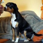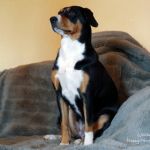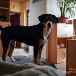 Zwischendurch übt Frauchen mit mir ZOS (im Wohnzimmer) und Aportieren.